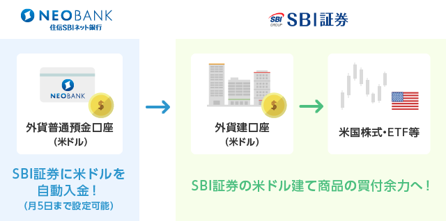 住信SBIネット銀行の外貨普通預金口座(米ドル)から、SBI証券の外貨建口座(米ドル)に、事前に設定した金額を自動入金するサービスです。金額と入金日(最大月5日まで選択可能)は、SBI証券の画面より設定いただきます。自動入金された米ドルはリアルタイムでSBI証券の米ドル買付余力に反映されますので、すぐに米国株式・ETFなどの米ドル建商品取引にご利用いただけます。