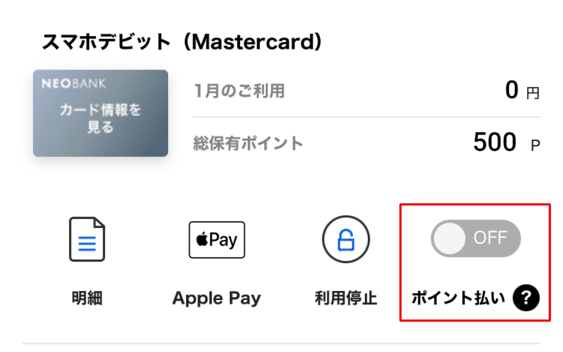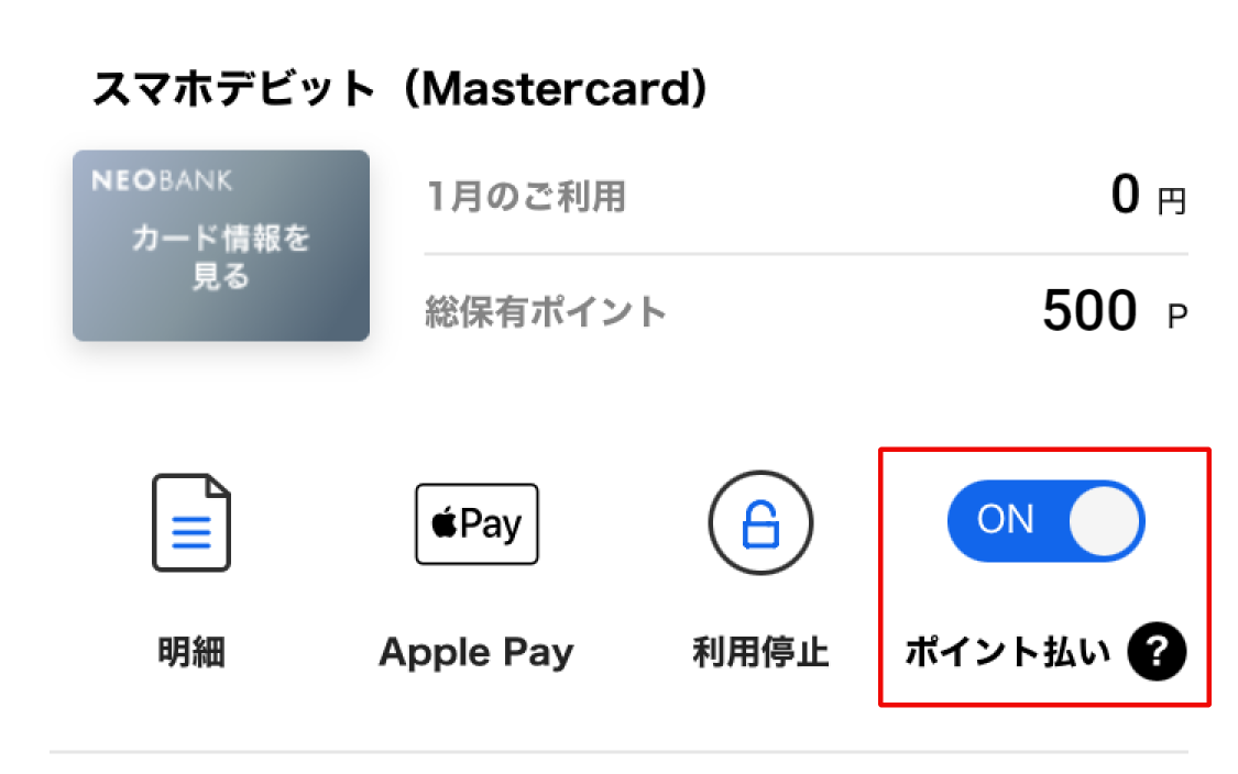 貯まったポイントは、デビットカードでのお支払い時に1ポイント1円換算でご利用いただけます。ご利用方法は下記をご確認ください。