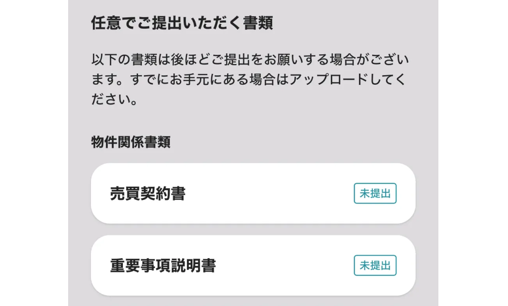 一覧画面の後半部分には、「任意でご提出いただく書類」が表示されています。