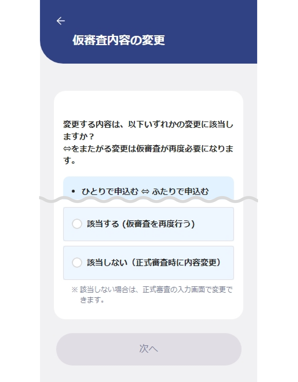 仮審査の結果画面で「この内容で正式審査に進む」ボタンを押したあとに内容変更をしたい場合は、ホーム画面下部に表示されている「仮審査結果内容の変更」リンクを押してください。