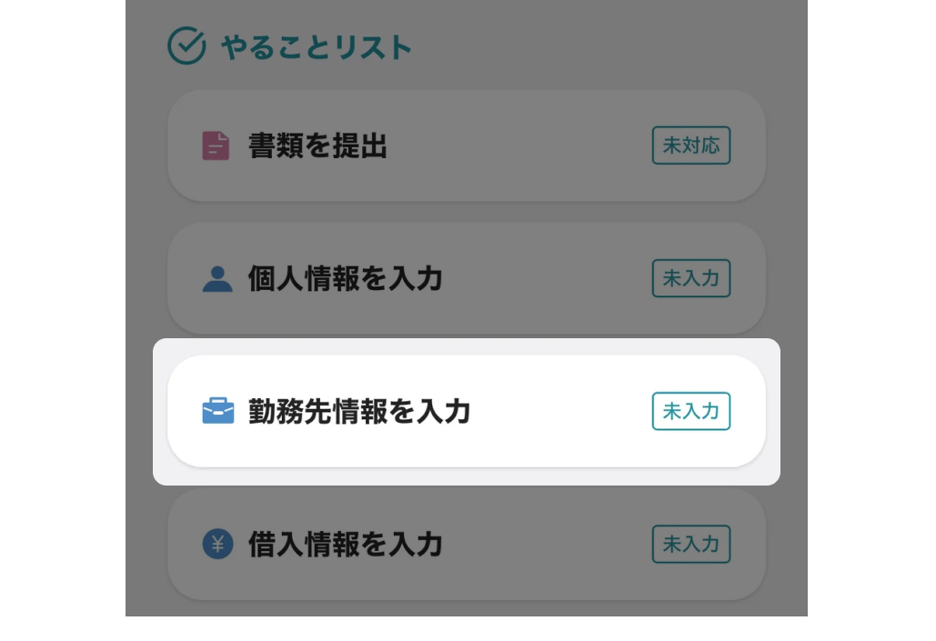 やることリストに表示されている「勤務先情報を入力」ボタンを押して勤務先情報を入力してください。
