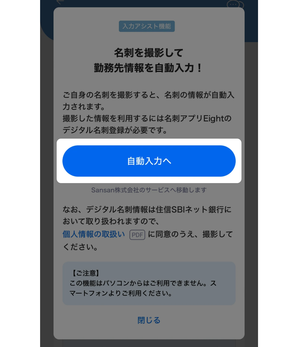 「自動入力へ」ボタンを押すと、Sansan株式会社のサービスへ移動します。