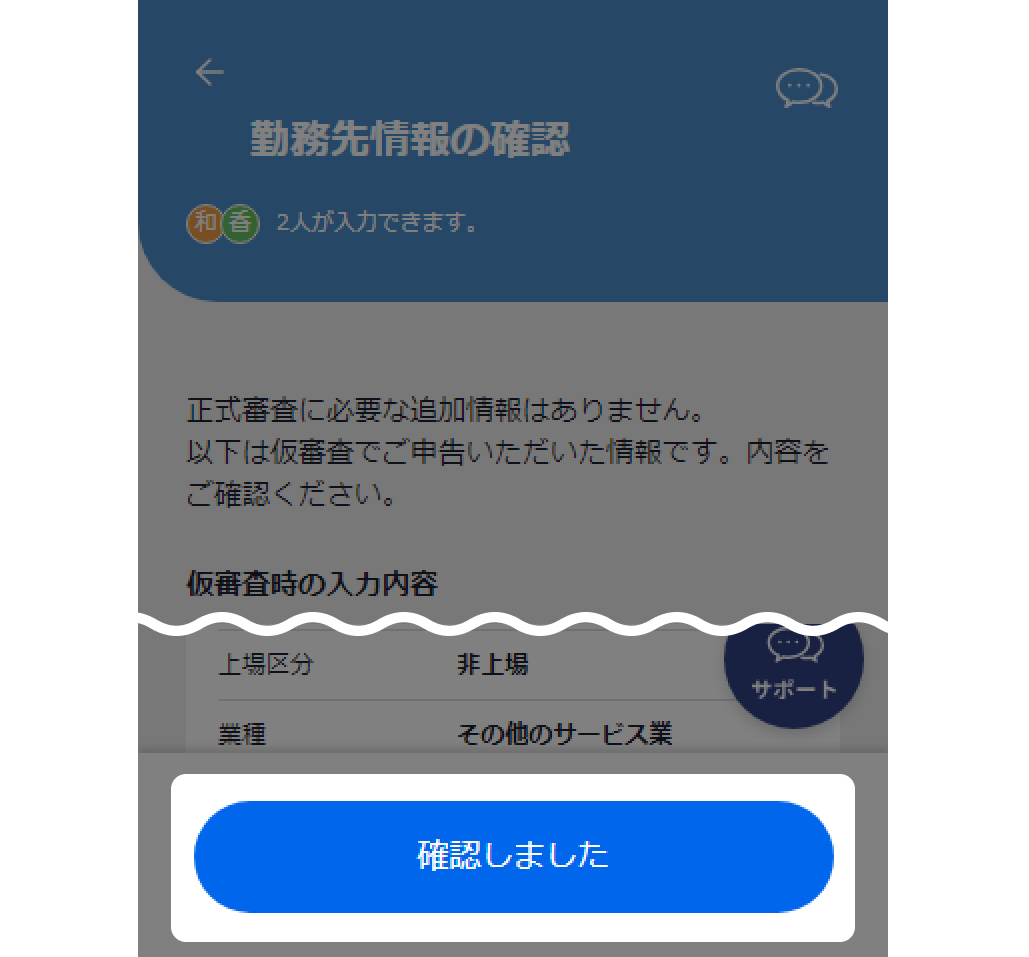 仮審査→正式審査へとお手続きを進められているかたは、正式審査時に追加で入力いただく勤務先情報はございません。