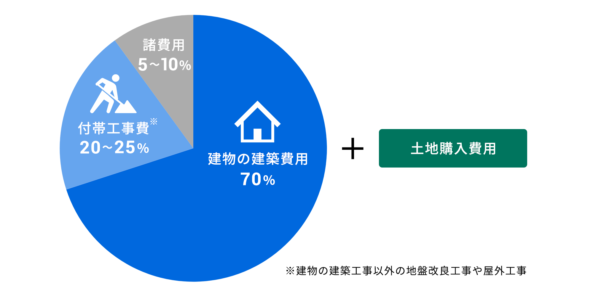 建物の建築工事以外の地盤改良工事や屋外の給排水工事、解体工事、庭や駐車場の外構工事は「付帯工事」と呼ばれ、一般的な費用相場は建築費全体の20%~25%とされています。