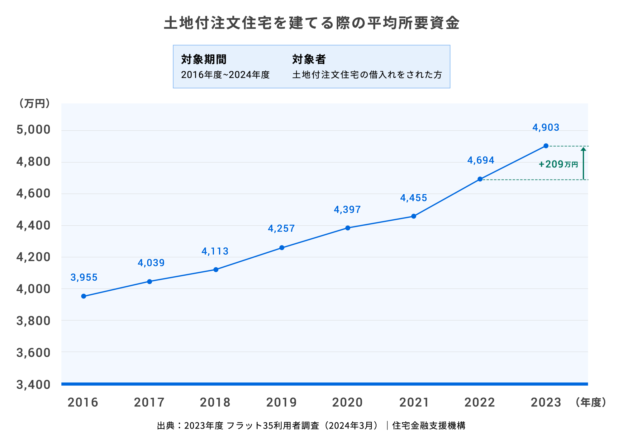 前項の同データを見ると、土地の取得と併せて家を建てる場合(土地付注文住宅)の費用相場は、全国平均で4,903万円でした。2022年度の結果と比べると、209万円増加しています。