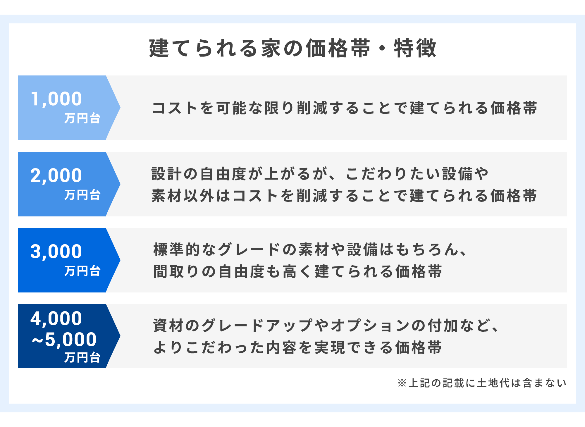 - 予算に応じて建てられる家の目安は異なり、できる限り費用を抑えるなら1,000万円台から、よりハイグレードな家を建てるなら4,000万~5,000万円台が相場となる。