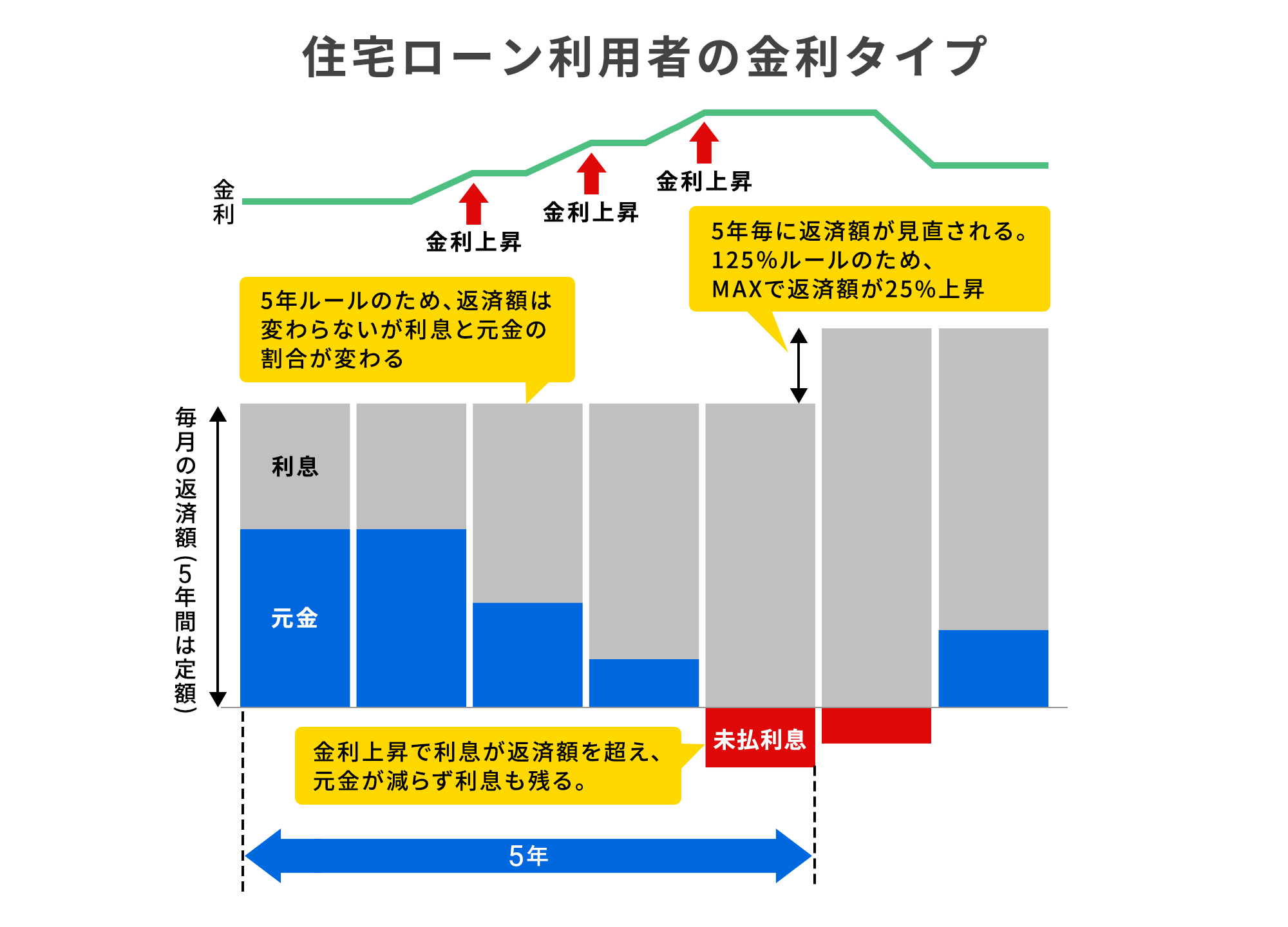 半年や5年ごとに行われる金利の見直しに合わせて、市場の動きを正確に予測することは極めて困難です。金利の上昇がなければ、未払利息などの返済に関するリスクは生じにくいでしょう。
