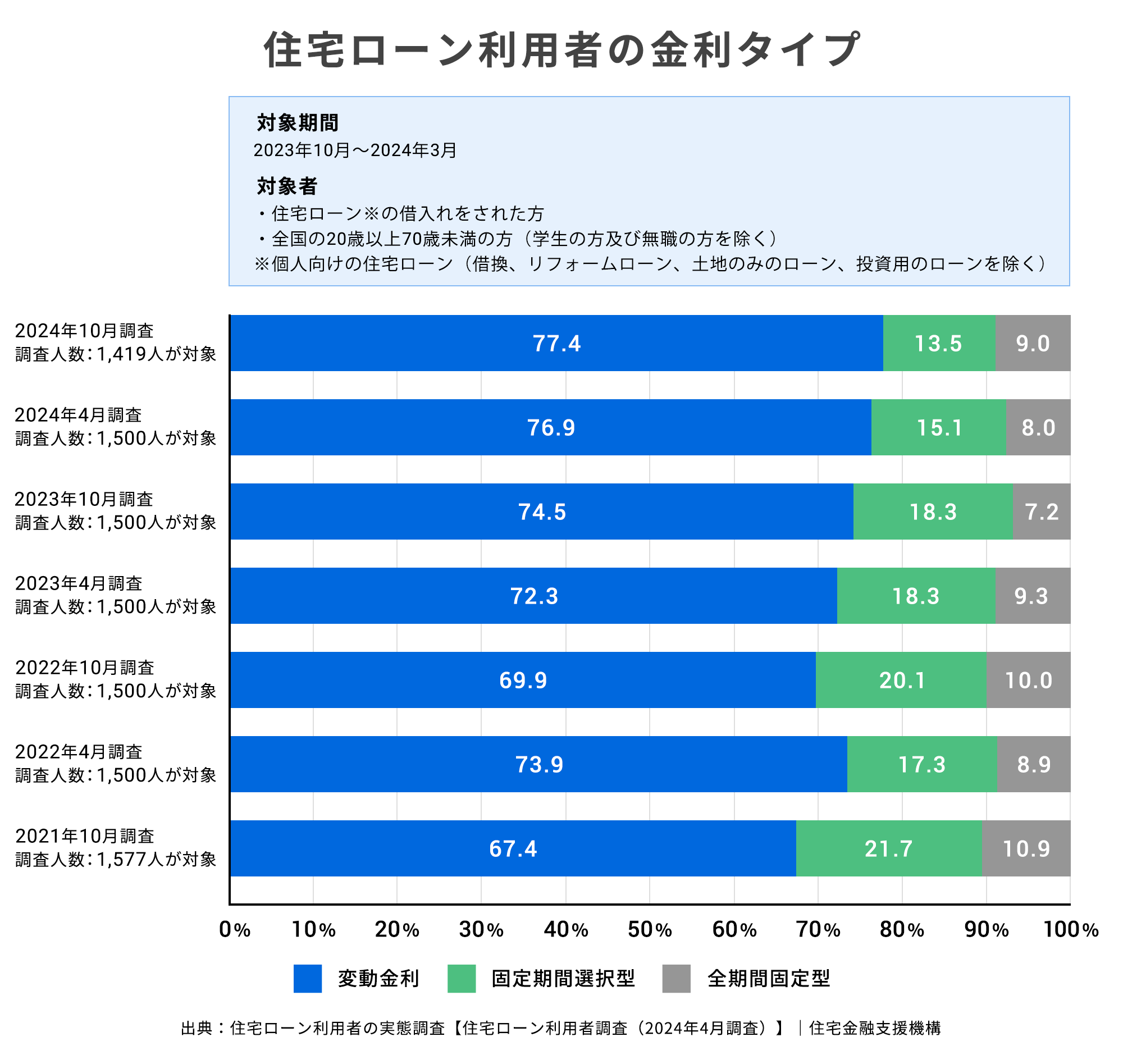 長年続いた超低金利政策の影響で、変動金利型の住宅ローンの適用金利は低水準を維持してきました。2023年に実施された住宅金融支援機構の調査では、住宅ローン利用者の約70%が変動金利を選択しており、人気が高い金利タイプだとわかります。