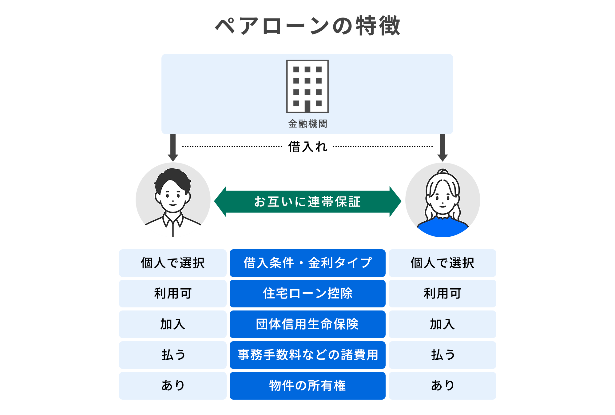 - ペアローンとは、一つの物件に対し夫婦又は親子がそれぞれ債務者となって住宅ローンを利用する方法。