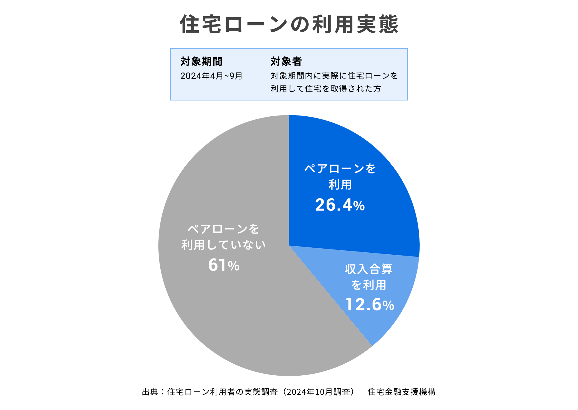 なお、住宅金融支援機構の「住宅ローン利用者の実態調査」によると、2024年4月から9月に住宅ローンを利用して住宅を取得したかたのうち、ペアローンを利用したかたの割合は26.4%でした。また、収入合算の詳細は後述しますが、住宅ローンを利用したかたの割合は12.6%であり、夫婦の収入を合わせてローンを利用しているかたが一定数いることがわかります。