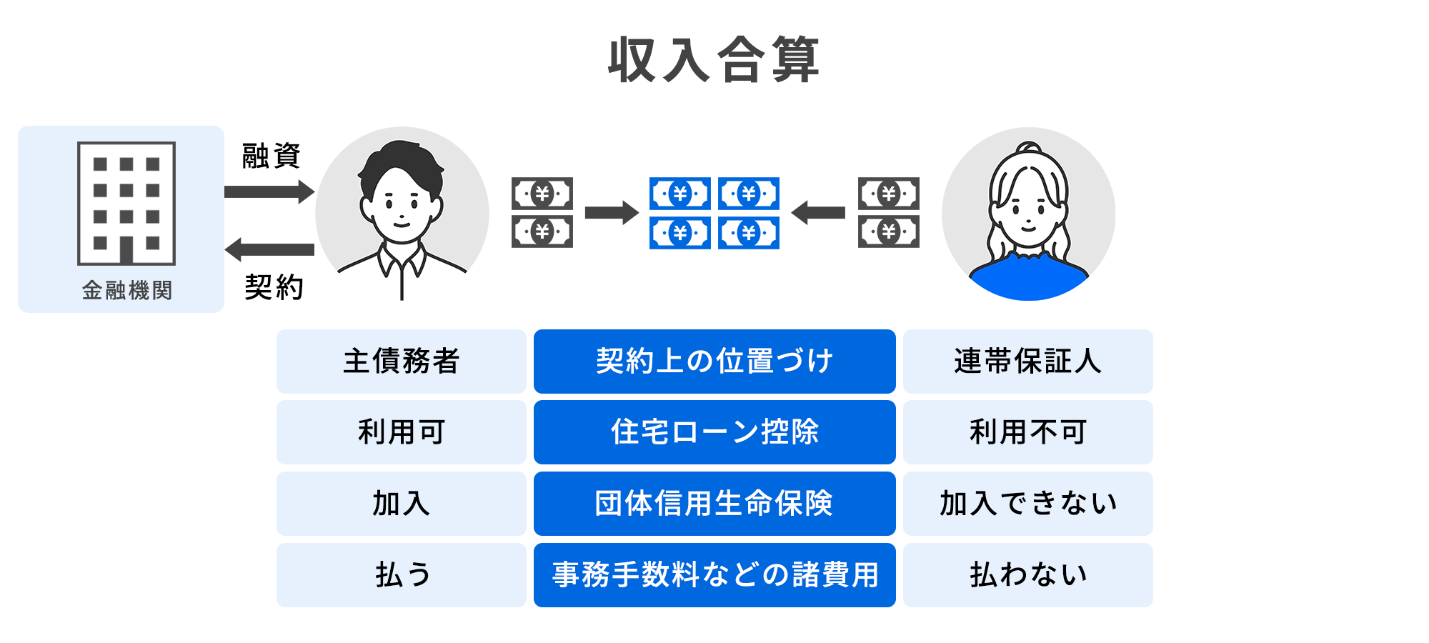収入合算のローンは、住宅ローンの申込者の収入に妻や親などの収入を合算し、その費用に基づいて借入額が決まる方法です。ローンの申込者が主債務者、収入を合算するかたが連帯保証人あるいは連帯債務者に位置付けられる点が特徴です。