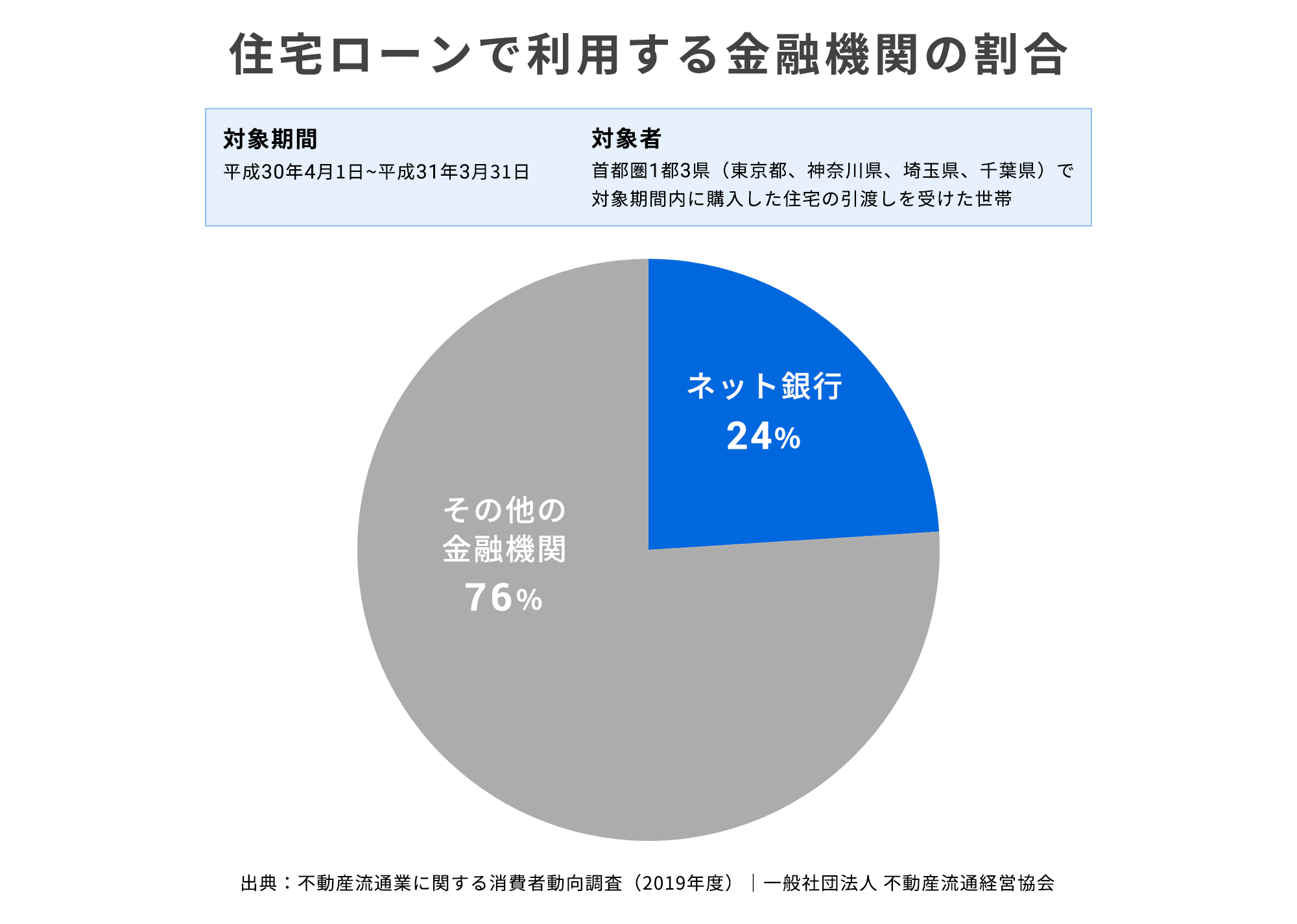 一般社団法人 不動産流通経営協会が実施した「不動産流通業に関する消費者動向調査(2019年度)」によると、ネット銀行の住宅ローンを利用しているかたの割合は24.0%でした。一般的な銀行の住宅ローンと比べると割合は低いものの、利用者は年々増加傾向にあります。