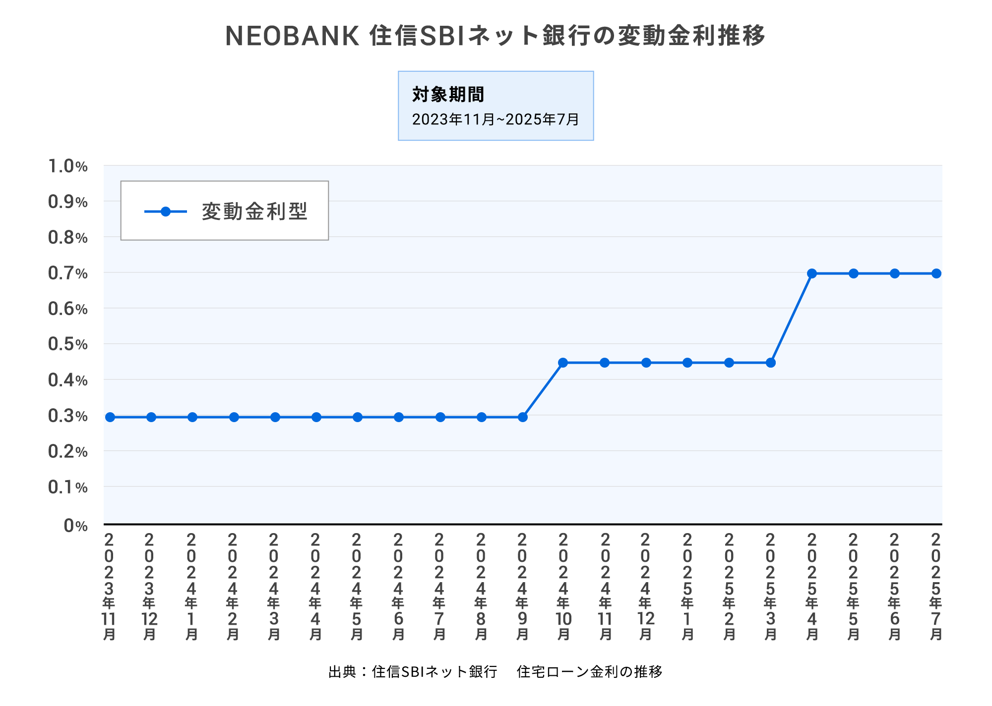 また、変動金利型のローンを選択した場合は、将来的な金利上昇によって返済費用が増加する可能性も考えられます。以下のグラフは、住信SBIネット銀行の近年の変動金利推移を表したものです。金利上昇のリスクを考慮したうえで、無理のない借入額を設定しましょう。