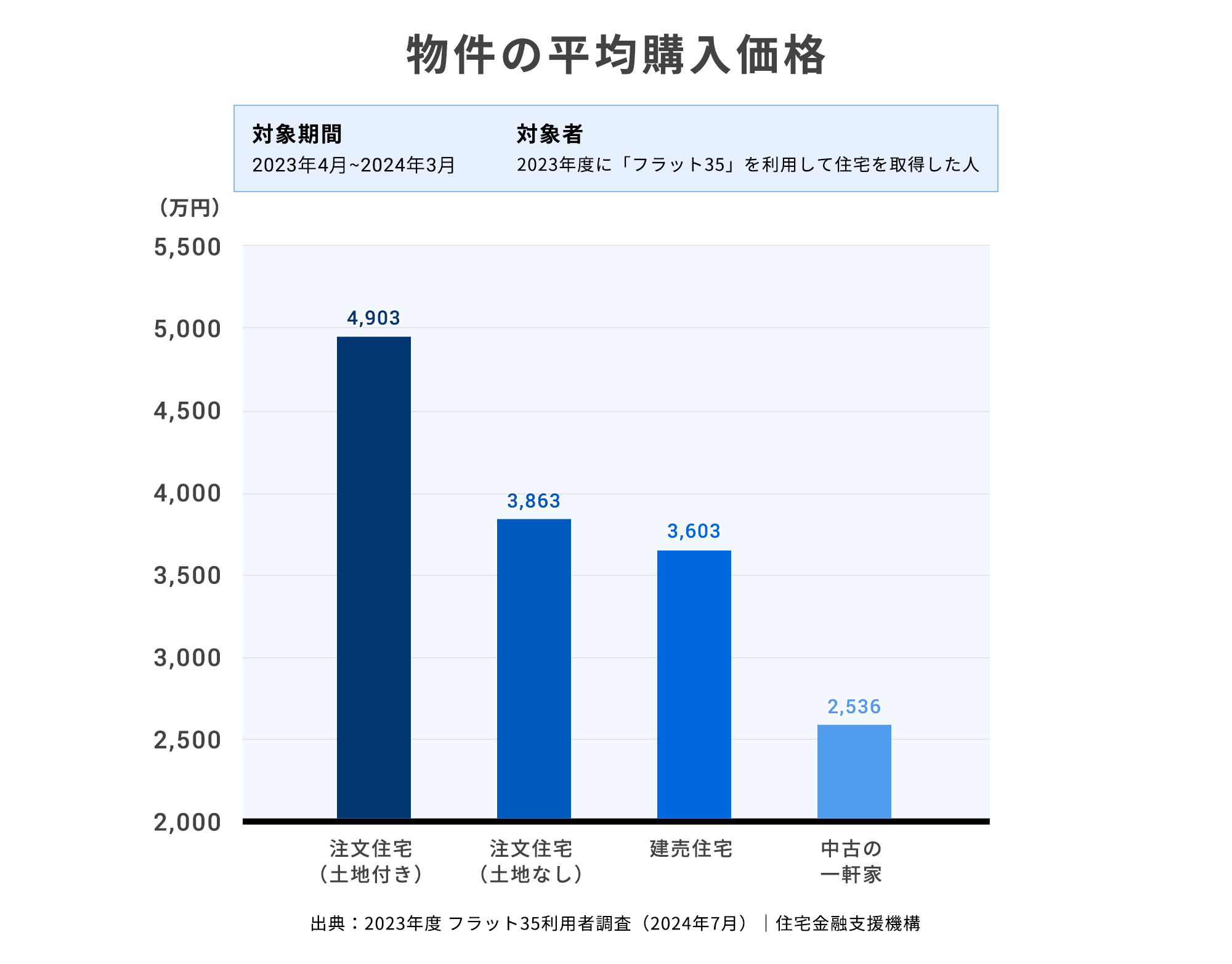 住宅金融支援機構の「2023年度 フラット35利用者調査」によれば、物件の購入費用の全国平均は注文住宅(土地付き)で4,903万円、建売住宅で3,603万円となっています。