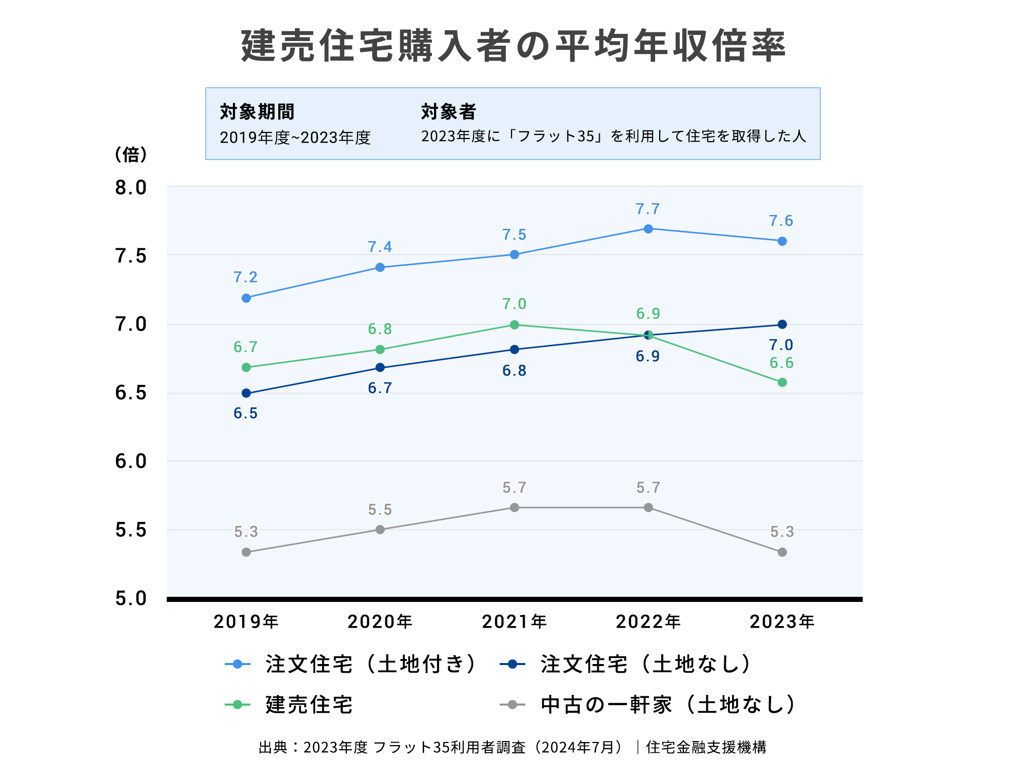 住宅金融支援機構の「2023年度 フラット35利用者調査」によると、建売住宅を購入したかたの平均年収倍率は6.6倍でした。