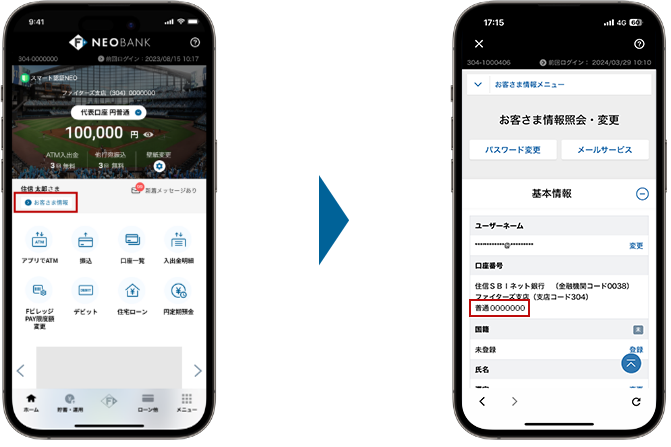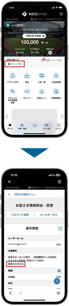 口座番号はアプリの「お客さま情報照会」から確認できます。