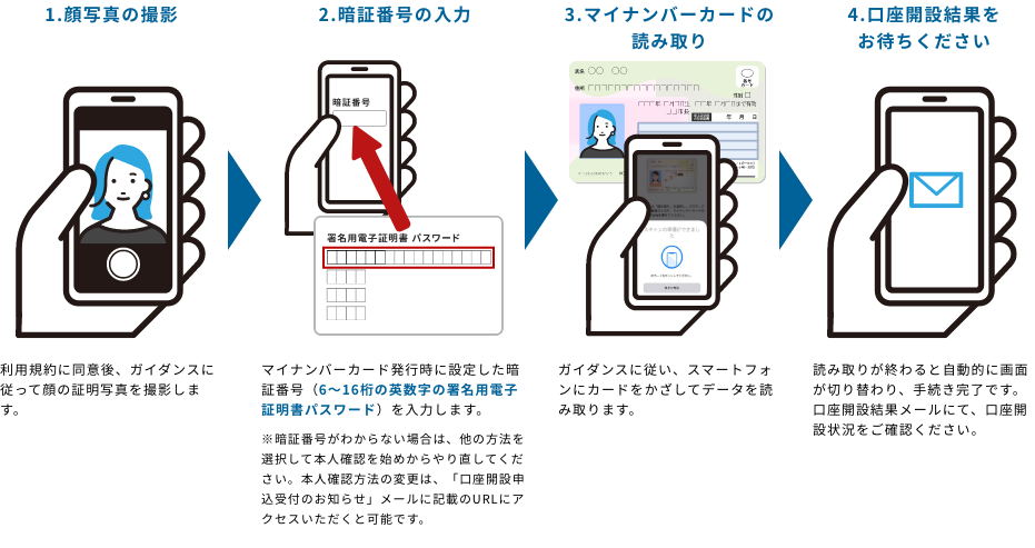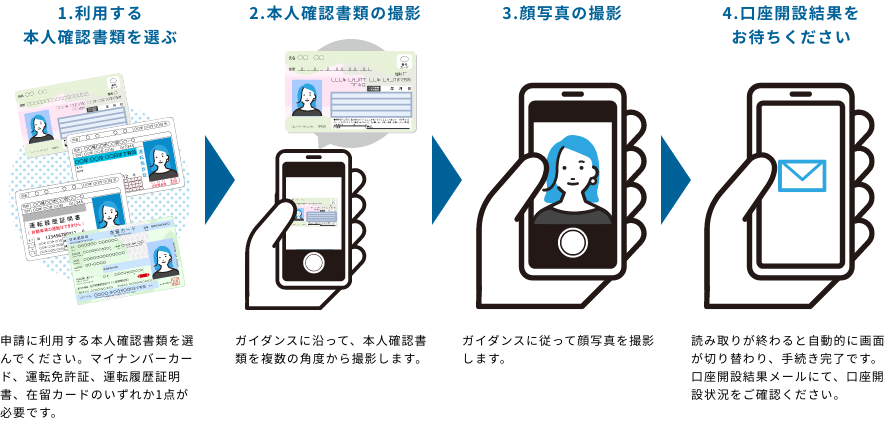- 郵送で本人確認をする場合は除きます。「マイナンバーカード読み取り」、「スマホで本人確認」が利用可能な端末や必要書類はこちらからご確認ください。