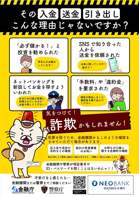 住信SBIネット銀行は、金融庁の要請を受け、預貯金口座の不正利用等防止に向けた対策の一層の強化しています。